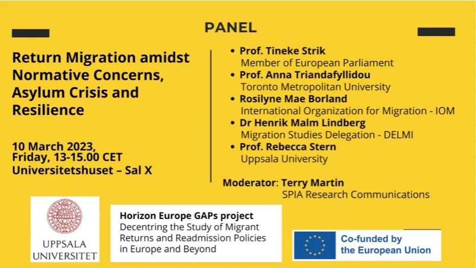 GAPs first panel took place at University House, Uppsala University and was moderated by SPIA director, Terry Martin. Two of the panellists were present – Prof. Tineke Strik (Member of European Parliament) and Prof. Rebecca Stern (Uppsala University). Two panellists participated online: Prof. Anna Triandafyllidou (Toronto Metropolitan University) and Rosilyne Mae Borland (IOM).